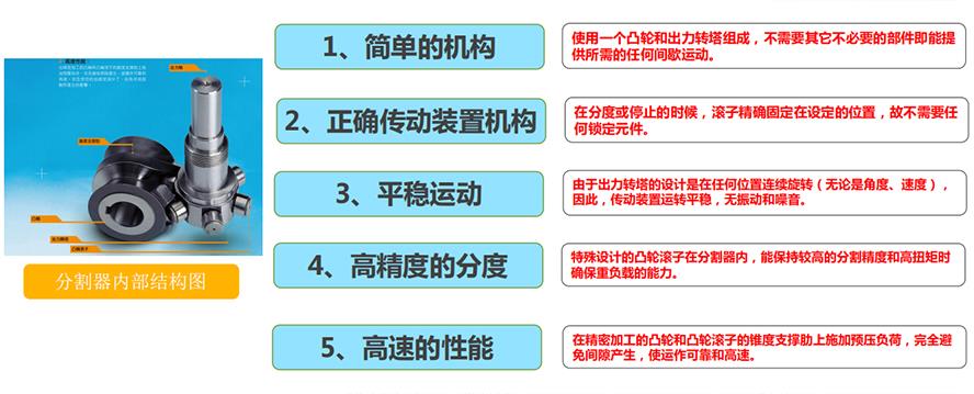 ④高精度的分度特殊设计的凸轮滚子在分割器内,能保持较高的分割精度和高扭矩时 确保重负载的能力